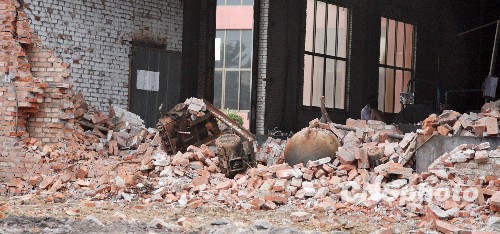 8月6日,石家庄市塌楼事故现场已被黑色网布隔离,在坍塌波及的临近某玛钢厂,工人正在“大洞口”内清理场地。8月4日上午,河北石家庄市西兆通镇南石家庄村的一座2层楼房突然坍塌,导致20人被埋,其中17人遇难。中新社发 翟羽佳 摄