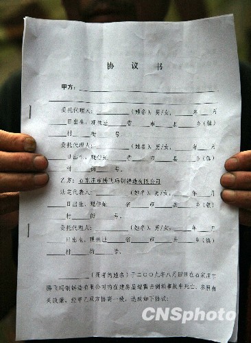 8月6日,石家庄塌楼事故遇难者曹某的家属向记者出示一份尚未签署的“救助”协议书,对事故原因表示质疑。这位家属称,此协议书为甲方石家庄腾飞玛钢铸造有限公司与乙方遇难者家属的协议,但被他拒绝填写,原因是他要求对方出具专家关于雷击导致楼房坍塌的事故认定,但对方没有提供。图为遇难家属向记者出示空白“救助”协议书。中新社发 翟羽佳 摄