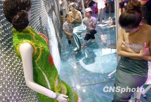 8月7日,避孕套“旗袍”与人体模特助兴性用品展。当日,第五届中国计划生育生殖健康新技术新产品博览会在北京开幕。中新社发 郑雄增 摄