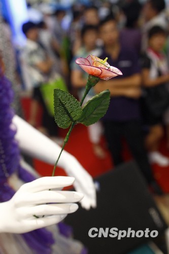 8月7日,安全套制作的“玫瑰”助兴性用品展。当日第五届中国计划生育生殖健康新技术新产品博览会在北京开幕。中新社发 郑雄增 摄