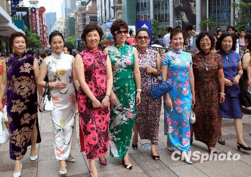 8月7日,逾两百位上海旗袍佳丽在南京路步行街齐秀旗袍,吸引众多游客观赏。据了解,这些来自上海旗袍沙龙的佳丽均年过半百,她们希望“作秀”能发扬光大旗袍这一非物质文化遗产。中新社发 潘索菲 摄