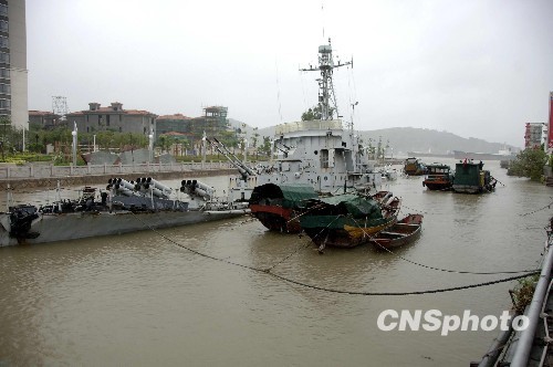 8月8日,今年第8号台风“莫拉克”带来强降雨,福州一锚地观光军舰被淹没。目前,台风中心正以每小时15公里的速度向西北方向移动,预计当天傍晚到夜里登陆福建省中北部沿海,最大可能是在福清到福鼎一带沿海。中新社发 王东明 摄