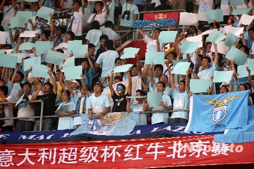 8月8日晚,北京奥运会开幕一周年之际,2009意大利超级杯在北京奥运会主体育场“鸟巢”上演,观众爆满。图为声势浩大的拉齐奥队球迷方阵。中新社发 任晨鸣 摄