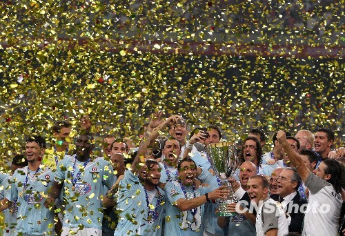 8月8日晚,北京奥运会开幕一周年之际,2009意大利超级杯在北京奥运会主体育场“鸟巢”上演,蓝鹰拉齐奥队展翅翱翔“鸟巢”,以2:1击败实力强大的意甲冠军国际米兰队,斩获2009意大利超级杯。 中新社发 任晨鸣 摄