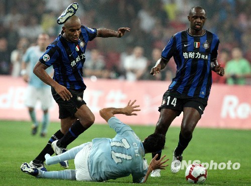 新近从国际米兰“叛逃”到拉齐奥队的阿根廷球星74号克鲁兹,下半时替补出场与老东家作战不但被昔日队友13号麦孔、14号维埃拉放到,战靴还被踢飞。中新社发 任晨鸣 摄