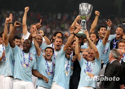 蓝鹰拉齐奥队在“鸟巢”展翅翱翔捧起2009意大利超级杯。中新社发 任晨鸣 摄