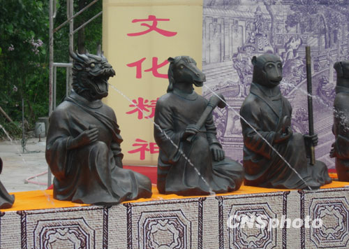 图为圆明园十二生肖兽首人身复原像中的龙、马、猴。中新社发 孙翔鸣 摄