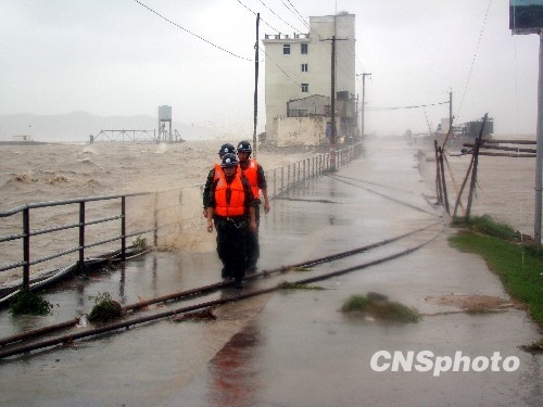 8月9日,台风“莫拉克”来袭,浙江温州沿海浊浪滔天,堤坝边卷起的巨浪高达数十米。温州边防支队所属21支抗台风应急分队已全部深入沿海一线,加强港口、码头、堤坝等重点地段的巡逻检查,及时劝阻观浪群众撤离至安全地带。中新社发 吴水斌 摄