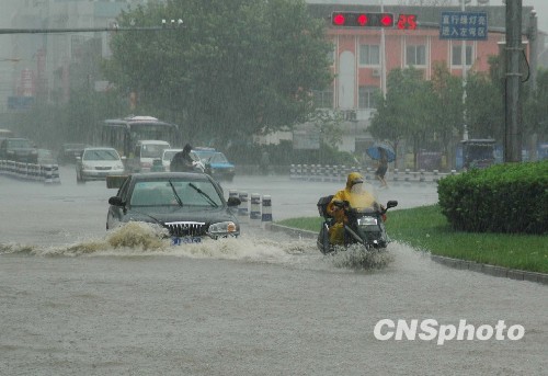 8月9日下午15时30分许,受今年第8号台风“莫拉克” 影响,浙江温岭闹市区人民东路一片汪洋。 中新社发 江勇兵 摄