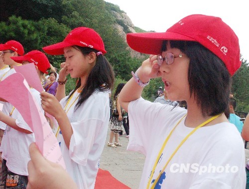 八月九日,三百多名青年学子在泰山参加了成人礼。这是泰山景区推出“中华泰山成人仪式”品牌之后接待的首批参加成人礼的团队。经过两个多小时的攀登,学子们登上了南天门,在泰山玉皇顶下的大观峰前举行了成人宣誓加冠仪式。图为学子们在举行成人宣誓。中新社发 孙弘 摄