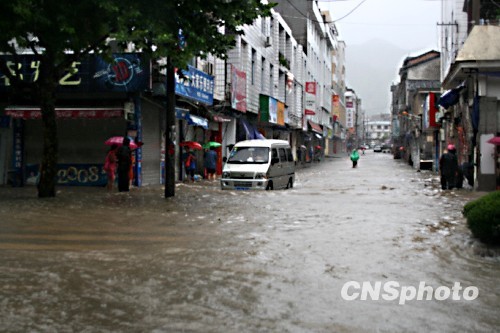 8月9日,受第八号台风“莫拉克”影响,福建柘荣县城区过程雨量达695mm,阵风11级以上,县城区防洪堤多处决堤,城区全部浸水,最深达2米,最低0.5米,受淹人口3万多人,地处低洼地段的机关单位、企业及群众民房一楼已浸水,全城店面紧闭。中新社发 陈丽彬 摄