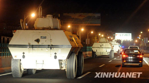 8月10日凌晨,武警车辆从乌鲁木齐地窝堡国际机场撤离。沙达提 摄