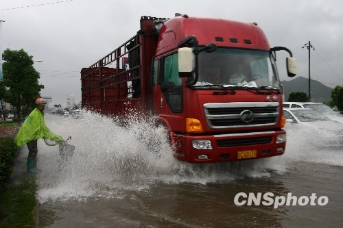 8月10日,受台风“莫拉克”影响,104国道1754km浙江省台州市路桥区桐屿路段积水严重,变成“河道”,排队通过的车辆如“百舸争流”。