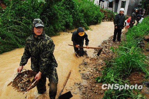8月10日,浙江省温州市平阳县昆阳镇城南干部和村民一起抢修台风毁坏的小流域水利设施。 台风“莫拉克”过后,浙江平阳群众纷纷开展生产自救。