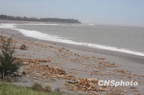 图为重灾区之一的旅游胜地台东县,海边绵延数十公里堆积漂流木,“沙滩变成木滩”,连海水也变色。中新社发 董会峰 摄