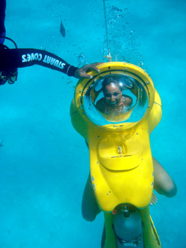 图为参赛佳丽“骑上”水下自行车潜入大海。