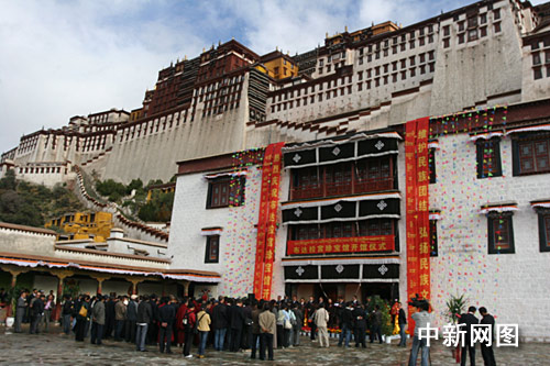 位于布宫正面脚下的雪城中的珍宝馆,建筑面积2000多平方米,展出文物两百多件,珍宝馆展览将分“史海钩沉”和“宫藏珍品”两个部分八个单元,今天开馆首日,有一批密藏珍贵文物及照片与公众见面。
