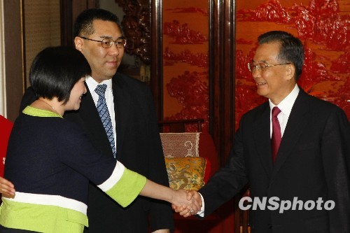8月11日,中国国务院总理温家宝在北京中南海紫光阁会见了新当选并获任命的澳门特别行政区第三任行政长官崔世安,代表国务院向崔世安颁发了任命他为中华人民共和国澳门特别行政区第三任行政长官的国务院令。图为温家宝向崔世安及其夫人表示祝贺。中新社发 盛佳鹏 摄