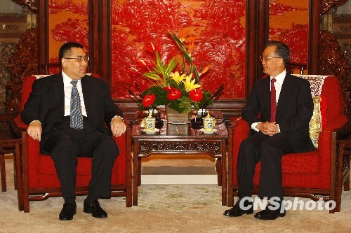 8月11日,中国国务院总理温家宝在北京中南海紫光阁会见了新当选并获任命的澳门特别行政区第三任行政长官崔世安。中新社发 盛佳鹏 摄