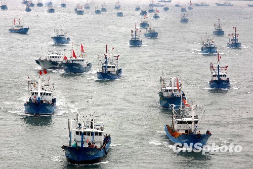 2009年8月11日上午8时40分许,在浙江省舟山渔港躲避台风“莫拉克”的近万艘东海作业渔船先后驶入东海各渔场恢复生产,来自福建、浙江象山等地避风的渔民希望台风后有个好收成。