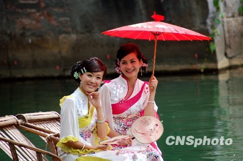 壮族姑娘王予嘉(右)和另一名壮族“金花”郭君在广西桂林阳朔拍摄一档电视节目。中新社发 刘万强 摄