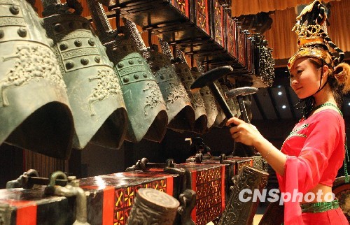 图为随州博物馆艺术团为各国佳丽演奏编钟乐舞。中新社发 钱兴强 摄