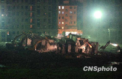图为工程机械正在对“倒覆楼”进行拆除作业。中新社发 潘索菲 摄