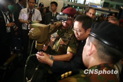 8月12日,第二届文莱国际防务展开幕,文莱苏丹哈桑纳尔·博尔基亚参观中国展厅并拿起某新型肩扛式防空导弹进行瞄准与操练。中新社发 莫小亮 摄