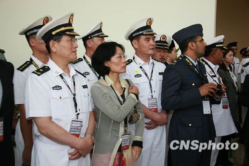 8月12日,第二届文莱国际防务展开幕,图为广州军区副司令员兼南海舰队司令苏支前少将和中国驻文莱大使佟晓玲等参加防务展开幕式。中新社发 仲继军 摄