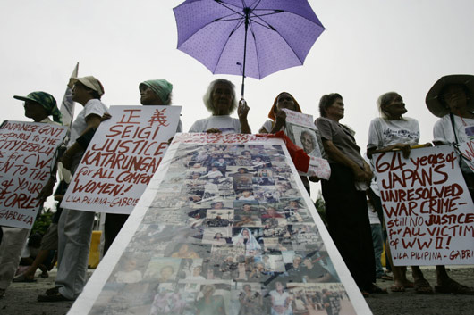 8月12日,在菲律宾首都马尼拉,妇女组织“Lila Filipina”的成员在日本驻菲律宾大使馆外举行抗议,要求日本政府为战时的罪行郑重道歉并予以赔偿。