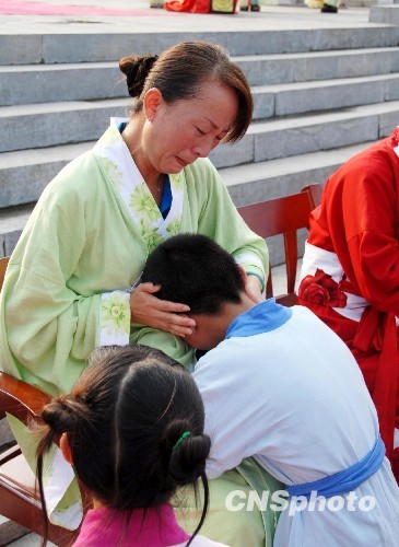 近日,河南省永城市芒砀山举行大型青少年成童礼仪式。35名8至14岁的儿童身着汉代服饰,按照传统方式参加了成童礼仪式。中新社发 庞德胜 摄