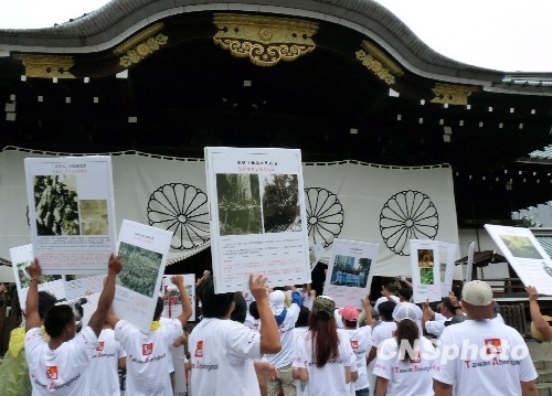 高金素梅8月11日率领“还我祖灵队”约50人首度成功“突袭”进入日本靖国神社正殿前的大广场,要求靖国还我祖灵及日本谢罪赔偿。中新社发 918网老吴 摄