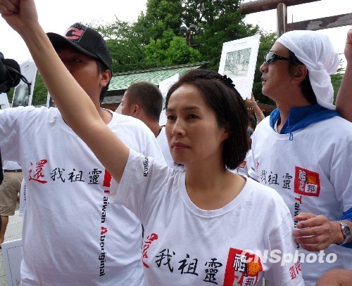 高金素梅8月11日率领“还我祖灵队”约50人首度成功“突袭”进入日本靖国神社正殿前的大广场,要求靖国还我祖灵及日本谢罪赔偿。中新社发 918网老吴 摄