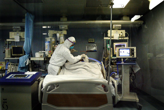 2009年8月13日,广州首现甲流重症病例在市呼吸病研究所治疗。该患者仍处于中度昏迷状态,钟南山等著名专家多次会诊,制定救治方案,积极救治。(人民图片)