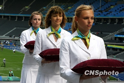 经过装饰的老体育场将于8月15日至23日举行第12届国际田径联合会世界田径锦标赛。中新社发 任晨鸣 摄