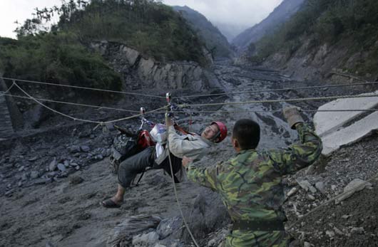 8月13日,救援人员利用简易搭设的钢索进入灾区搜寻生还者。台风“莫拉克”重创台湾南部,高雄县六龟乡新开村遭到泥石流袭击,事故可能已造成多人伤亡,该村与外界联系的唯一一座桥梁已被大水冲断,救援人员积极展开营救。