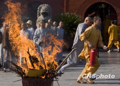 8月13日下午,洛阳市消防支队官兵为“中国第一古刹”白马寺僧众举行消防知识讲座,并指导僧众进行灭火实战演练。消防官兵针对木结构古建筑的火灾特点,为百余名僧众讲授建筑防火、消防设施使用方法、功能、用途,基本的灭火、防火及逃生自救常识。在白马寺山门前,消防官兵和僧众联合进行灭火实战演练,共保古建筑国宝安全。相关链接:白马寺是佛教传入中国后第一所官办寺院。它建于东汉明帝永平11年(公元68年),距今已有1900多年历史,被尊为“释源”和“祖庭”。