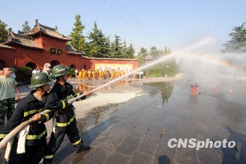 图为消防官兵和僧众在白马寺山门前联合进行灭火实战演练。中新社发 张光辉 摄