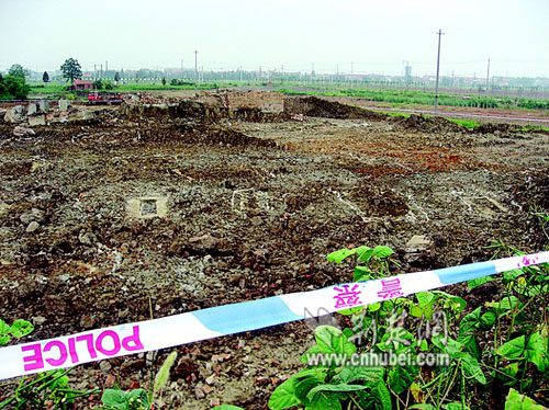 昨日(13日)下午,在现场看到,这个工地有三四个足球场大,已经被封锁。从痕迹上看,已挖出了两三米深。在工地的北侧,石灰线密密麻麻地标出了一座座古墓;工地中间,巨大的水泥墩被推土机推得横七竖八,并可看到裸在外的棺板和墓砖。