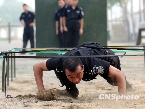 公安特警正在进行匍匐超越障碍训练。中新社发 万善朝 摄