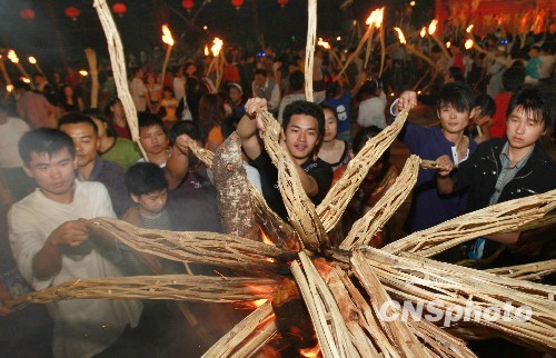 图为游客正在点燃火把。中新社发 甘娜 摄
