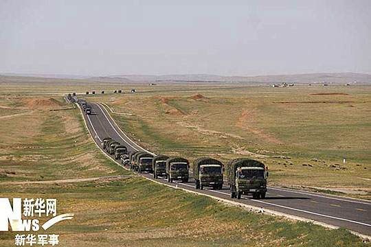 8月13日,"跨越-2009"实兵检验性演习进入第4天。参演部队在草原上奔袭。刘逢安 摄