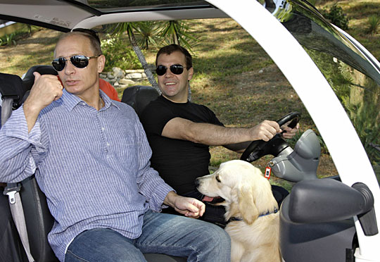 图为俄罗斯总统梅德韦杰夫在总统官邸为普京“当司机”。
