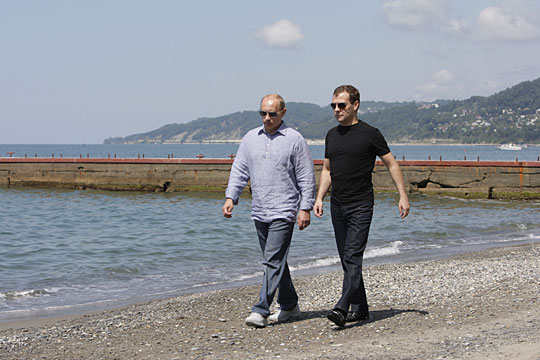 图为俄罗斯总统梅德韦杰夫和总理普京在海边散步。