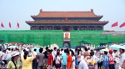 2009年8月14日,北京天安门城楼搭起了绿色围挡准备进行粉刷修缮,以迎接建国六十周年的到来。