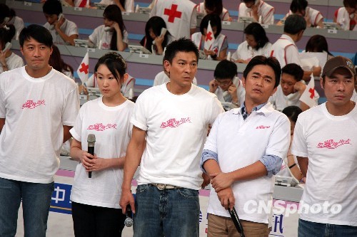 香港著名艺人刘德华(中)、黎明(左一)等专程来台湾参加赈灾募款晚会。中新社发 董会峰 摄