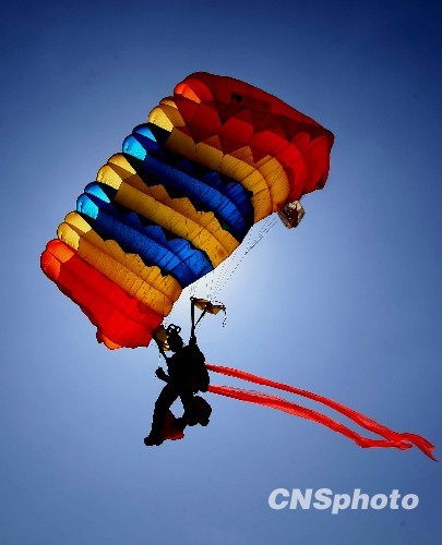 图为跳伞运动员装扮的“天女”从空中缓缓落下。中新社发 刘新 摄