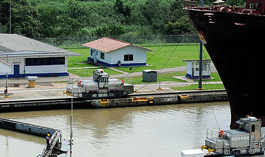 巴拿马运河的员工(左)在船只通过佩德罗米格尔水闸时工作。