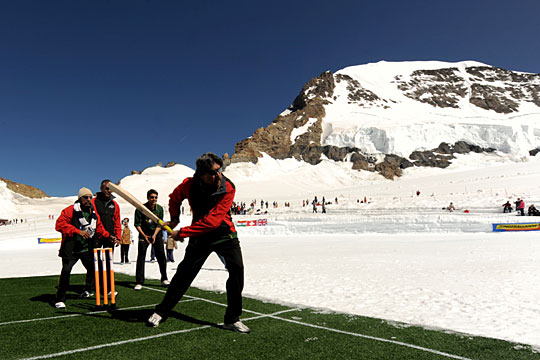 8月15日,为庆祝印度独立62周年,印度体育旅游公司在阿尔卑斯山11333英尺(约3454.30米)高的地方举行了一场别开生面的雪地板球赛。
