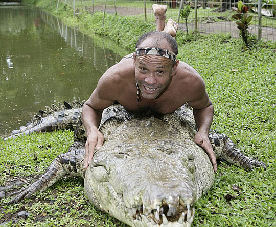 据英国媒体8月16日报道,除了人被鳄鱼吃掉或杀掉鳄鱼以外,你还能想象二者之间发生什么故事么?哥斯达黎加渔民Chito告诉你,鳄鱼还可以成为人的宠物!真是骇人听闻!但事实的确如此。20年前,Chito在一个湖里搭救了一条因吞食奶牛而被当地农民射中头部的鳄鱼Pocho。当时的它已经奄奄一息,好在经过Chito的细心照料,Pocho逐渐恢复了健康。之后经过10年的磨合,Chito和Pocho开始成为了朋友,二者经常在一起嬉戏玩耍。如今,大量来自世界各地的游客也纷纷前去见证这一非凡的人鳄情缘。